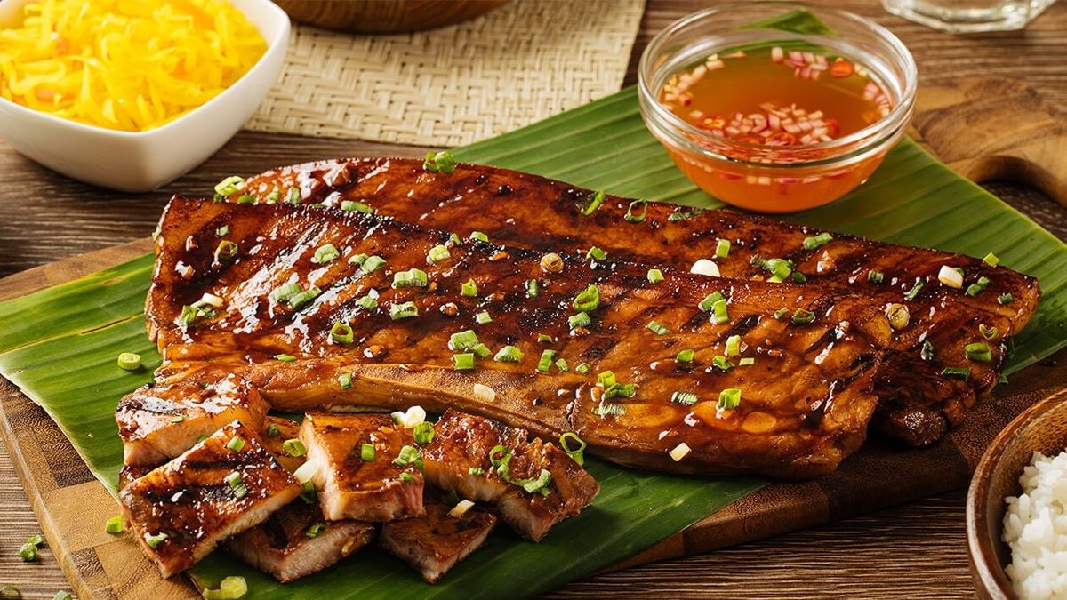 گفتنی است تکههای شکم خوک قبل از کباب شدن، ساعتها روی زغال چوب در ماریناد سیر، سس سویا و فلفل قرمز خوابانده میشوند.