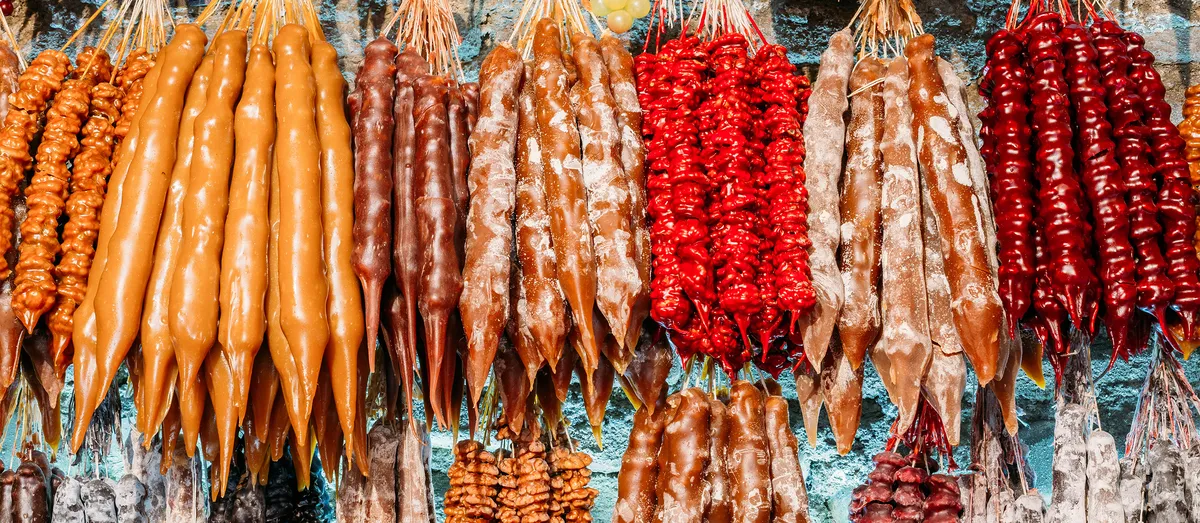 وقتی به گرجستان سفر میکنید، حتما در بازارها و مکانهای مختلف شهر، چورچخلا را خواهید دید که در رنگهای مختلف از سر در مغازهها آویزان شده و نمایی منحصر به فرد به این بازارها میدهند. چورچخلا به صورت سنتی از کنستانتره انگور درست میشودکه آن را روی گردوهای آسیاب شده میریزند و بعد از بسته بندی، صبر میکنند تا خشک شود.