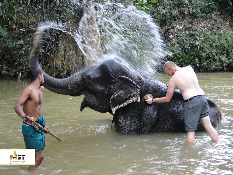 بعد از اینکه نقاشیهای رنگی بر روی بدن این حیوان عظیم الجثه کشیدید نوبت به استحمام آنها میرسد. در این بخش شما باید رنگها را از روی بدن آنها با آب بشویید. مطمئن باشید که قرار است یکی از فراموش نشدنیترین لحظات زندگی خود را تجربه کنید. برای اینکار شما به دریاچهای در نزدیکیهای مزرعه فیلها برده میشوید. در نتیجه میتوانید به کمک آب این دریاچه فیلها را شست و شو دهید.