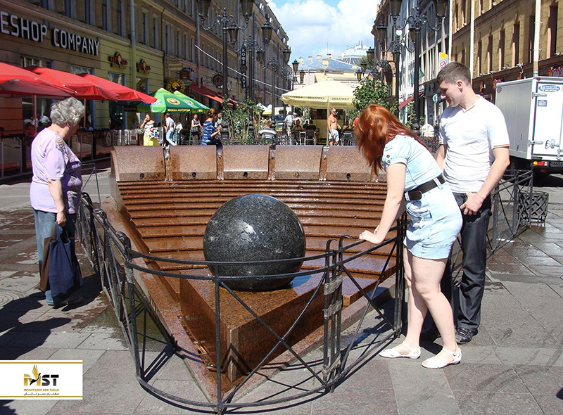 این آبنما با اسم انگلیسی Rotating Sphere در واقع یک گوی بزرگ سنگی است که روی بستری قرار گرفته و آب از اطراف آن به زمین میریزد. حرکت دائمی آب روی این گوی احساس چرخ زدن به آن میدهد. هنرمندی که این آبنما را طراحی کرده، عنوان کرده که خواستهی او نمایش گذر زمان که غیر قابل توقف است در این گوی بوده. با این که این آبنما یک اثر قدیمی نیست، با این حال رسمی بین مردم محلی و حتی گردشگران به وجود آمده که گفته میشود زمان آرزو کردن اگر به این گوی دست بزنید، آرزویتان به واقعیت بدل میشود.