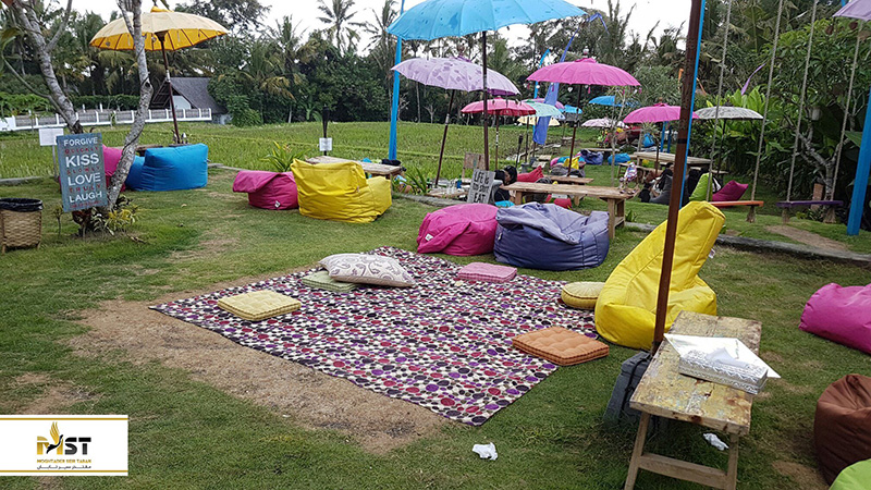 این رستوران مکانی شاد و رنگارنگ است که خانوادهها می توانند کل روز را به استراحت زیر نور آفتاب، لم دادن روی کیسههای رنگارنگ، شنا کردن و نوشیدن آب میوههای تازه بگذرانند. در حالی که با خیال راحت به بچهای خود اجازه می دهید روی زمین چمن شده بدوند یا از تاب سواری لذت ببرند، میتوانید به شالیزارهای برنج نگاه کنید و چرت بزنید. همچنین این رستوران جایی عالی برای تماشای غروب آفتاب هم هست.