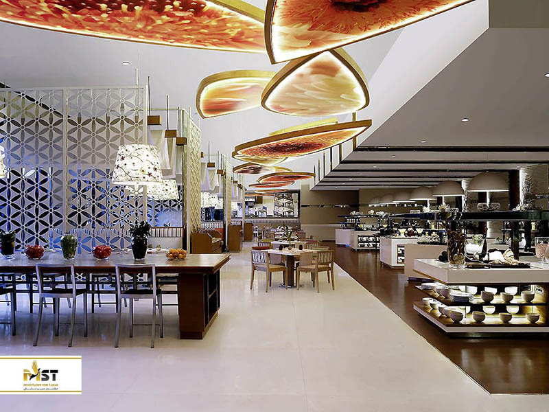 به لحاظ طراحی دکوراسیون باید گفت رنگ فضای داخلی به رنگ سفید گرم مینیمالیستی است که در ترکیب با کفپوش سنگی و پنجرههای بزرگ مشرف به فضای سبز مجتمع خرید Santushti، شما را از حس لذت و آرامش در حین خوردن غذا سرشار خواهد کرد.