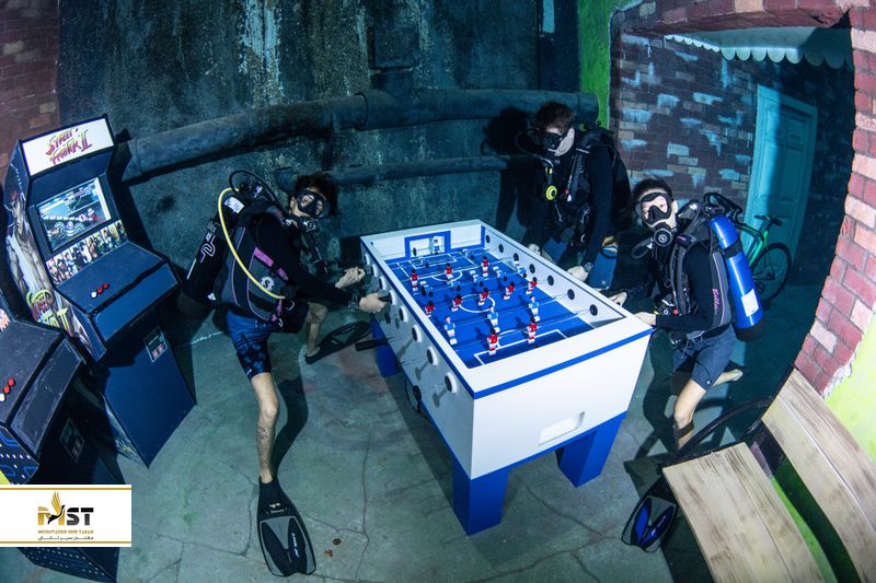 به طور کلی حتما نیازی نیست به ۶۰ متری عمق آب بروید، بلکه در همان اولین بخشهای استخر، دکورهای خیلی جذابی کارگذاری شده که در هنگام غواصی میتوانید در میان آنها گردش کرده و عکسهای جالبی ثبت کنید. برای مثال بخشی از فضا همچون کتابخانه طراحی شده، یک ماشین واقعی درون آب واقع گشته و میتوانید روی دوچرخهای که زیر آب قرار دارد، پا بزنید، شطرنج بازی کنید و روی موتور سیکلت عکس بگیرید! شاید تعجب کنید اما اگر همراه دوستانتان به Deep Dive Dubai رفته باشید، میتوانید زیر آب فوتبال دستی هم بازی کنید!