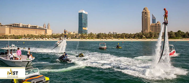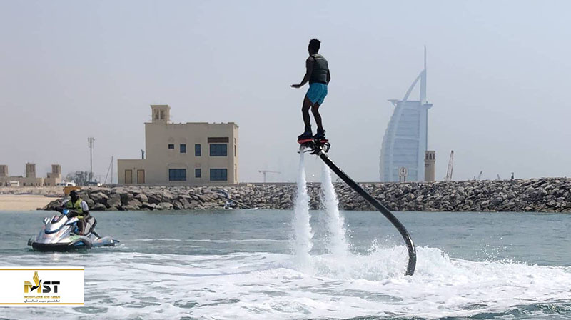 فلایبورد: فلایبورد یکی از فعالیتهای جدید آبی محسوب میشود که به وسیلهی دستگاههای مخصوص قابل انجام است. در این فعالیت شما روی بوردی قرار میگیرد که موتورهای جت از زیر آن آب را با فشار زیاد خارج میکنند و شما به پرواز در آمده و میتوانید، حرکتهای مختلف را روی هوا اجرا کنید.