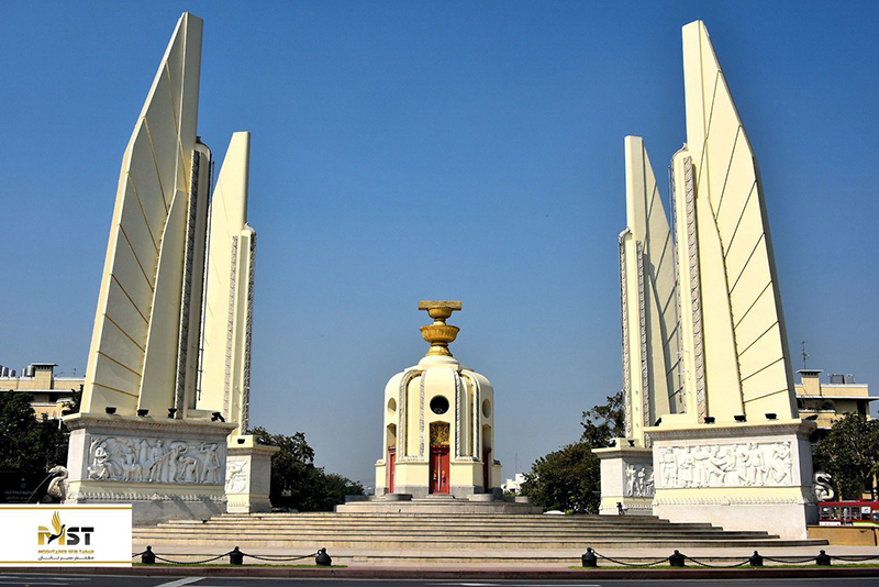 بنای دموکراسی در جاده Ratchadamnoen قرار گرفته که همیشه خدا با جمعیت دائمی ترافیک احاطه شده است. این میدان نمادی بزرگ و به سبک غربی از تصویب دموکراسی و آزادی در تایلند است که توسط شهروند تایلندی ایتالیایی تبار کورادو فروچی طراحی شد. این بنای تاریخی نمادی از تاریخ تولد قانون اساسی در ۲۴ ژوئن ۱۹۳۲ است. در مرکز آن یک پایه قرار دارد که در داخل آن کپی از قانون اساسی ۱۹۳۲ قرار داده شده است. ۴ سازه بال مانند ۲۴ متری اطراف آن نیز نشان دهنده تاریخ امضای قانون اساسی است و هر کدام نمادی از یکی از ۴ شاخه نیروهای مسلح تایلند هستند که از آن محافظت میکنند.