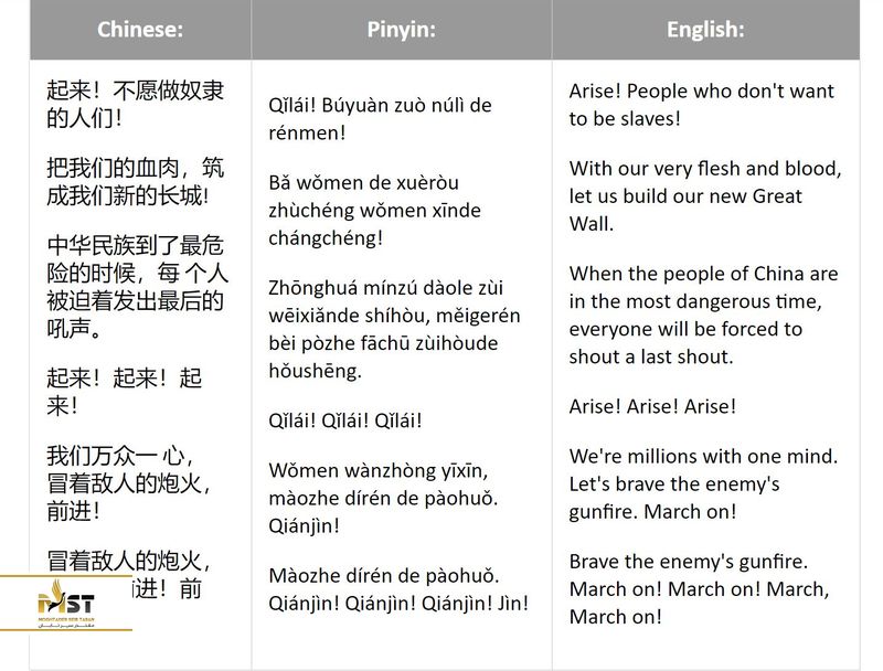 سرود ملی جدید جمهوری خلق چین در واقع برداشتی از آهنگی است که در سال ۱۹۳۲ ساخته شده بود. سرودی که با شور و حرارت برای فیلمی نواخته میشود و آن را "نای اِر" و "تیان هان" ساخته بودند. بعدها در سال ۱۹۴۹ سرود ملی کنونی کشور با الهام از آهنگ ساخته و دوباره در سال ۱۹۷۸ تغییراتی را به خود دید. در زیر متن سرود ملی را به زبان محلی و همچنین انگلیسی برای شما قید میکنیم.