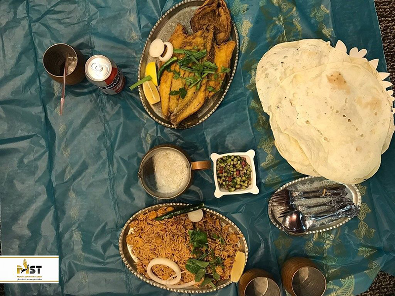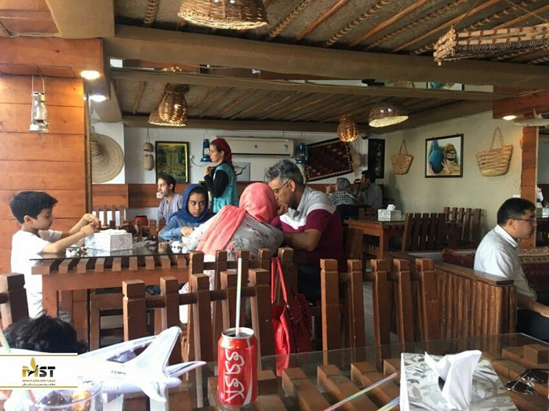 این رستوران سه طبقه که فرهنگ مردمان بومی جنوب را به خوبی به رخ میکشد انواع غذاهای ایرانی و خاورمیانهای، عربی و دریایی را که با مواد بسیار تازه و ادویههای محلی تهیه میشوند سرو میکند و در این میان ماهی شکم پر و قوزی گوشت و مرغ طرفداران بیشتری دارند.