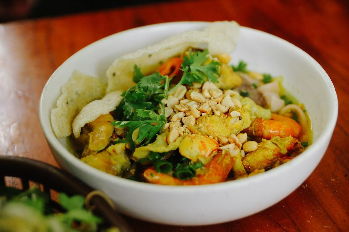بخشی سالاد، بخشی سوپ باعث شده تا به این نتیجه برسید، می کوانگ (Mi Quang) دچار بحران شخصیت شده است! اما همین ترکیب به نظر عجیب، یک سوپ نودل فوقالعاده خوشمزه را به وجود آورده که به یکی از پرطرفدارترین غذاهای کشور ویتنام نزد گردشگران بدل شده است. این غذا شامل نودل ویتنامی، آب گوشت ذردچوبهای، گوشت سرخ شده، سس ماهی، سبزیجات و لیمو بوده و در رستورانها نیز یک سری چیزها مثل گل موز نیز به آن اضافه میکنند. اما شما میتوانید در بوفههای غذاهای خیابانی، می کوانگ را با قیمتی پایین تهیه کرده و از طعم فوقالعاده عالی آن لذت ببرید.
