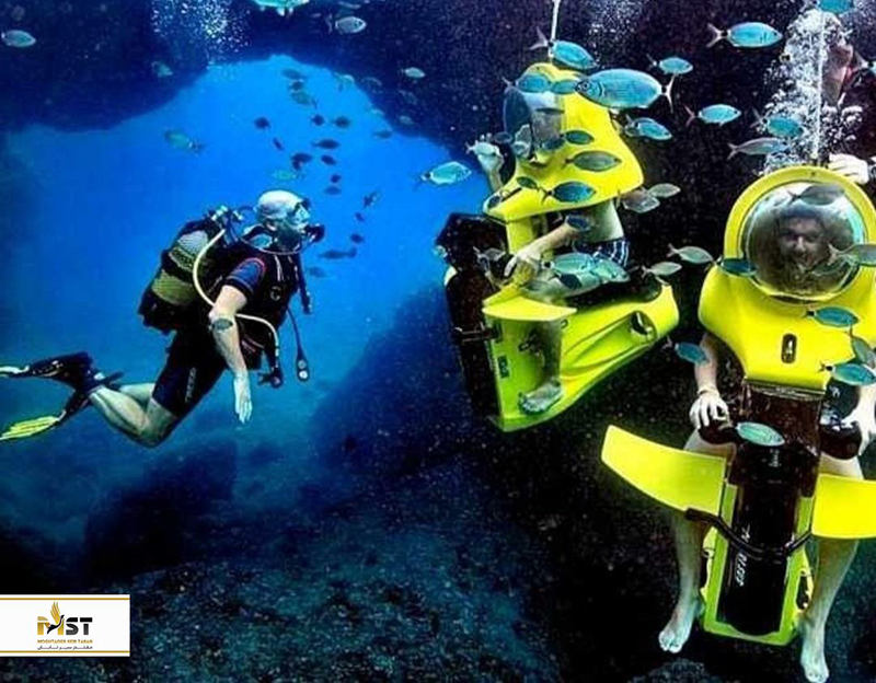 یکی از تفریحات متفاوت و البته لاکچری که در تور کیش فرصت امتحان کردن آن را خواهید داشت، سوار شدن به اسکوتر دریایی است. میتوان ادعا کرد که جزیره کیش در حال حاضر تنها مقصد گردشگری کشور است که شما در آن میتوانید سوار شدن به اسکوتر دریایی را تجربه کنید. اسکوتر دریایی نوعی وسیله برای غواصی در آبهای زلال به منظور تماشای حیات وحش در اعماق آب است. تمامی افراد بالای ۱۲ سال که از سلامت کامل جسمی برخوردار هستند میتوانند از اسکوتر دریایی لذت ببرند.