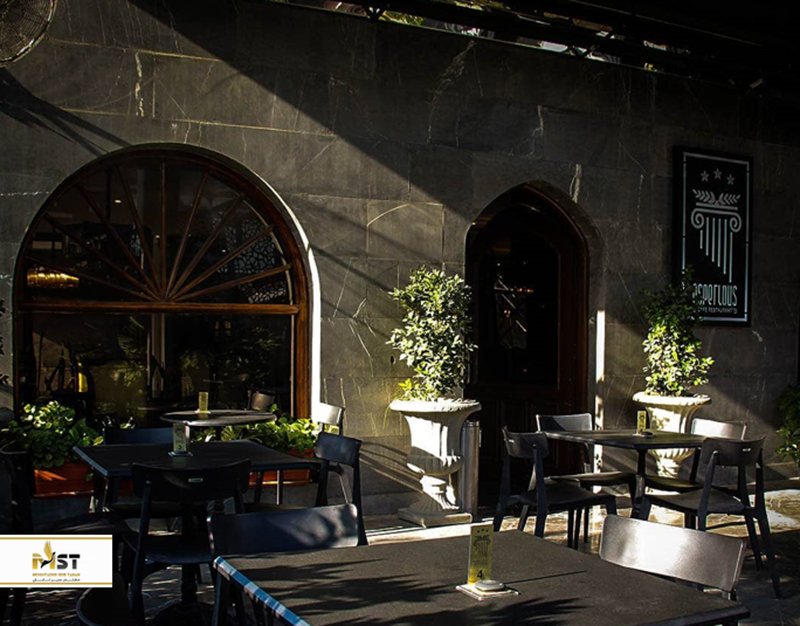 نمای سنگ گرانیتی تیره همراه با میزها و صندلیهایی به همین رنگ در فضای باز که یاد آور طراحی سبک صنعتی است و محیطی شیک و رسمی را رقم میزند، در بدو امر به استقبال مشتریان این کافه رستوران میآیند. اگر به دنبال فضایی خصوصی برای مهمانان ویژه هستید، میتوانید بخش VIP را رزرو کنید. اما سایر فضاهای این مکان نورگیر و دنج و زیبا نیز، حظ بصری را در حین صرف انواع غذاهای بین المللی و ایرانی به شما هدیه میدهند. به خصوص اینکه غذاها نیز دارای تزئینات قابل توجه و زیبایی هستند. در ضمن این محیط شیک یکی از بهترین مکانها برای خانواده ها محسوب میشود. قیمتها بسیار مناسبند و همچنین سیگار کشیدن در این کافه رستوران ممنوع است!