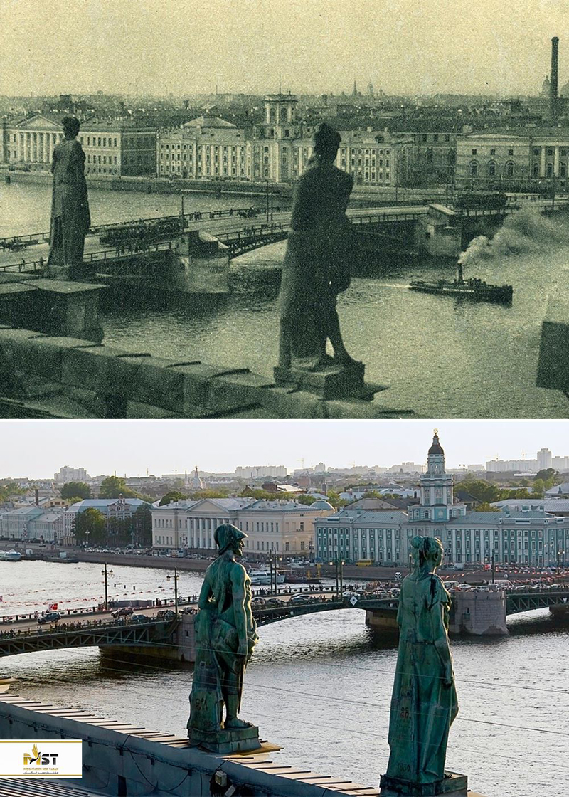 شاید کمترین تفاوت را در عکسها قبل و بعد از این پل معروف بتوان مشاهده کرد. جایی که هنوز دو پیکر تراشی بزرگ و زیبا، به سمت پل در حال نگه کردن به شهر هستند و همه چیز جلال گذشته را حفظ کرده است. این پل از نمادهای مهم شهری سنت پترزبورگ محسوب میشود که قصر زمستانی را به جزیره واسیلیسکی متصل میکند. این پل در سال ۱۹۱۶ ساخته شده بود و بعدها روی آن مرمت و نوسازی صورت گرفت. همچنین از سال ۱۹۹۰ نیز دیگر تراموا و اسبها، حق گذر از پل را نداشتند.
