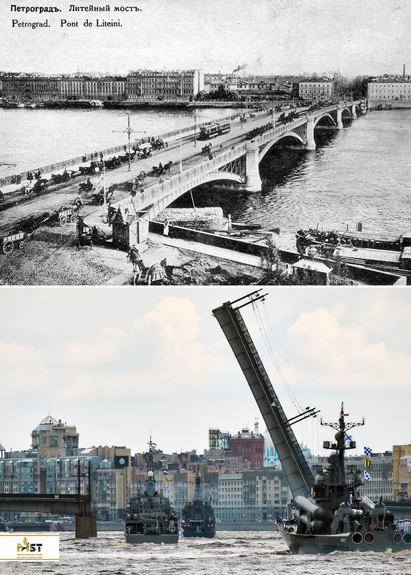 پل اصلی که بر روی نِوا ساخته شده بود، به سال ۱۸۷۹ بر میگردد. پلی که مکانیک پیچیده و خاصی داشت و میتوانست باز شود تا قایقها و کشتیها از زیر آن رد شوند. این پل بعدها در دهه ۷۰ میلادی نوسازی شد و به شکلی که امروز میبینید در آمد. پلی که برای مردم شهر حیاتی بوده و البته گردشگران نیز بدون شک هنگام بازدید از سنت پترزبورگ آن را میبینند. عکسیهایی که میبینید مربوط به سالهای ۱۹۱۰ و ۲۰۱۸ هستند و اگر چه از دو زاویه کاملا متفاوت گرفته شدهاند، اما میتوانید تغییرات شگرفی که در این یک قرن اتفاق افتاده را به راحتی باز شمارید.