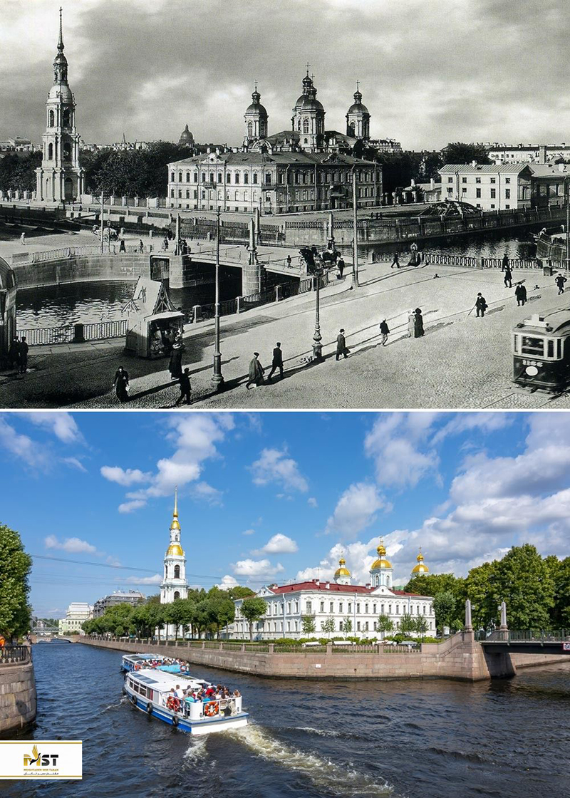 درست در نقطه تلاقی کانالهای گریبویِدوف و کریوکوف یکی از شاهکارهای سبک معماری باروک در سنت پترزبورگ یعنی کلیسای جامع نیکولسکی واقع شده است که به خاطر برج ناقوس معروفش، بین گردشگران شهرت دارد. این نقطه از شهر که در عکس بالا از روی یکی از آپارتمانهایی که دیگر وجود ندارد گرفته شده، میبینید که ساختار کلیسا دقیقا همانی است که در گذشته بوده. حالا این مکان یکی از نقاط مهم گردشگری شهر است و از ۷ پل بر روی این تقاطع قابل دسترسی بوده که البته در این عکس نمیتوان همهی پلها را مشاهده کرد.