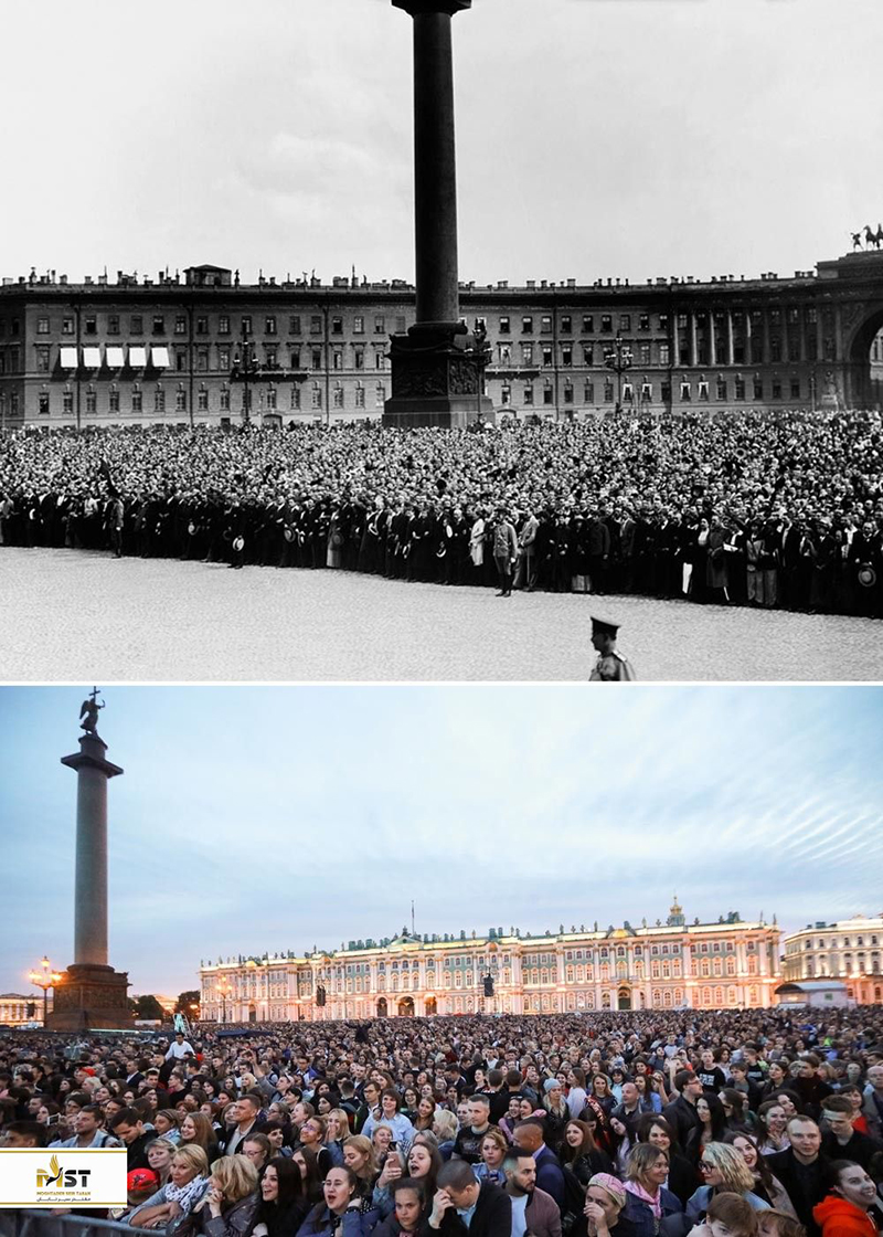 عکس اولی که برای این میدان در پست گذاشتهایم مربوط به سال ۱۹۱۴ است. محلی که درست در جلوی قصر زمستان واقع شده و در این عکس، تزار ورود به جنگ جهانی اول را به صورت رسمی اعلام کرده بود. بعدها همین مکان جایی بود که راهپیماییهای انقلابی در آن صورت گرفت و خیلی از تغییرات روسیه در آنجا شکل گرفت. البته حالا اوضاع تغییر کرده و مراسمات مختلف و جشنوارهها در آنجا برگزار میشود و محلی برای گردهمایی گردشگران است.