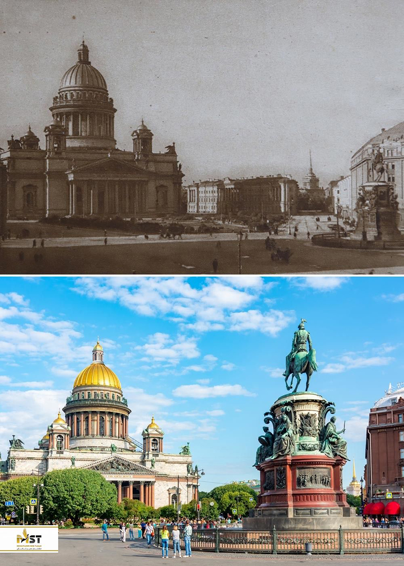 این دو عکس از دو زاویه مختلف گرفته شده و از خیلی لحاظ نمیتوان کاملا آنها را با هم مقایسه کرد. با این حال چیزی که در تمامی عکسهای این پست مشخص است، هم پوشش گیاهی سنت پترزبورگ بیشتر شده و البته تعداد ماشینها نیز بیشتر شده است و این ترافیک آزار دهنده به زندگی مردم رخنه کرده. این کلیسای زیبا در طول انقلابها و اتفاقات تاریخی هیچ گاه آسیب ندید و حتی تندیس امپراطور نیکولاس اول نیز از اتفاقات مختلف جان به در برد حالا به زیبایی در این بخش از شهر خودنمایی میکند.