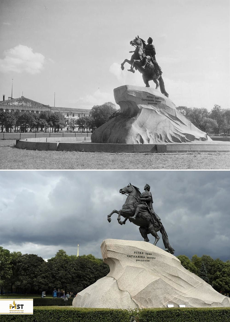 عکس اول در سال ۱۹۴۶ گرفته شده و عکس دوم متعلق به سال ۲۰۱۳ است. در این عکس نیز پیداست که پوشش گیاهی در سنت پترزبورگ بسیار بهتر از گذشته شده است. این پیکر تراشی بزرگ و زیبا نیز از پیتر کبیر انجام شده و یکی از تندیسهای فوقالعاده زیبا و با ظرافت شهر است. این مجسمه بزرگ یکی از چیزهایی است که حتما در سفر به سنت پترزبورگ، باید از آن دیدن نمایید.