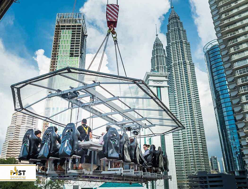 Dining in the Sky KL نام یک رستوران (اگر بشود نامش را رستوران گذاشت) عجیب است که این روزها چند نمونهای از آنها در چند خاص دنیا همچون دبی ساخته شده است. در این محل شما برای صرف شام روی یک سکوی خاص رفته و پشت میزهایی مینشینید که صندلیهایش کمبرند ایمنی دارد. سپس برای صرف شام و تماشای یک نمای ۳۶۰ درجه زیبا از کوالالامپور، با جرثقیل ۴۵ متر به ارتفاع برده میشوید!