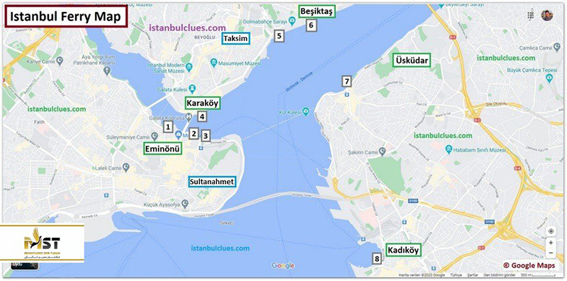 شهری که به وسیلهی یک پهنهی آبی به دو بخش تقسیم شده، حتما باید دارای مسیرهای حمل و نقل عمومی دریایی هم باشد که استانبول با فریهای عمومی (و البته قایقها و کشتیهای خصوصی) این مهم را برای گردشگران و مردم محلی خود فراهم کرده است. ۸ بندر مهم برای این منظور در نظر گرفته شده که فِریهای عمومی از آنجاها حرکت میکنند و به جاهای مختلف شهر میروند. این ایستگاهها همانطور که در نقشهی زیر مشاهده میکنیدبه ترتیب اعداد شامل توریول، شهیر هاتلاری، امینولو، کاراکوی، دنتور، بشیکتاش، اوسکودار و کادیکوی میشود.