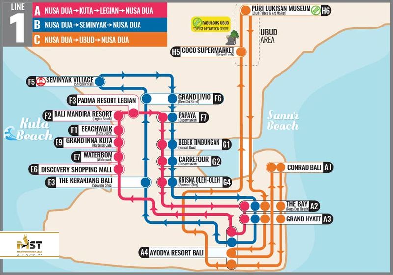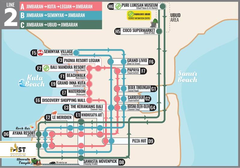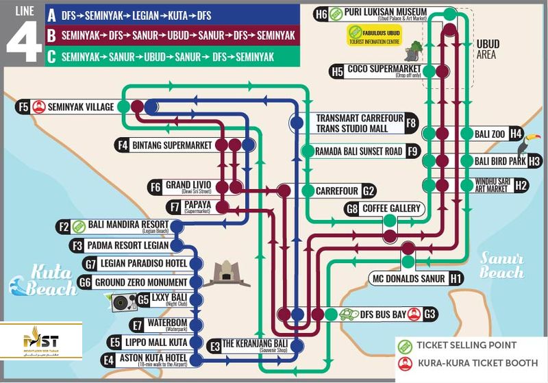 یک سری اتوبوسهای شهری در بالی وجود دارد که در مسیرهای توریستی حرکت کرده و بیشتر گردشگران برای رفت و آمد در بالی از آنها استفاده میکنند. شما میتوانید بلیط آنها را در داخل خود اتوبوس تهیه کنید. در کل ۴ مسیر اصلی برای اتوبوسها در نظر گرفته شده که هر کدام دارای مسیرهای فرعی هم هستند که در زیر نقشه هر ۴ مسیر را برای شما قرار میدهیم: