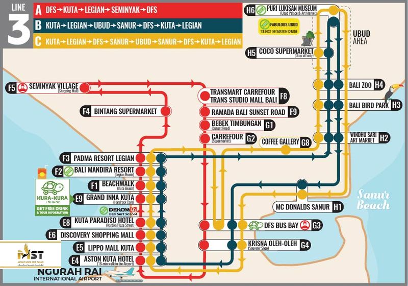 شرکت Kura-Kura در واقع برندی است که این مسیرهای اتوبوس رانی در بالی ترتیب داده و با توجه به این که در جاهایی همچون کوتا، لگیان، سمینیاک، سانور، جیمباران، نوسا دوا و اوبود، ایستگاههای مختلف وجود دارد، به همین خاطر شما میتوانید در تور بالی با این اتوبوسها نیز به خیلی از جاهای گردشگرپذیر مهم شهر بروید. هزینهی بلیط این اتوبوسها نیز بین ۲۰ تا ۵۰ هزار روپیه است که براساس مسیر با هم متفاوت بوده و ربطی به تعداد ایستگاههایی که طی میکنید ندارد.