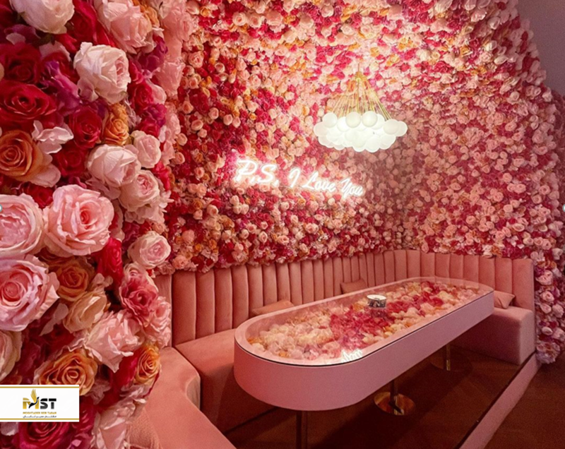 و اما فضای داخلی طبقه دوم مملو از گلهای صورتی بوده و در رنگهای طلایی، سفید و صورتی غوطهور است و فضایی عالی را برای ثبت عکسهای اینستاگرامی رقم میزند. در اینجا چند اتاقک رمانتیک و دنج نیز درنظر گرفته شدهاند که با دریایی از گلهای قرمز و صورتی پوشانده شدهاند. همچنین مبلمان صورتی پاستلی مخملی متعددی نیز در جای جای کافه درنظر گرفته شدهاند.