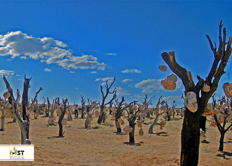 این مکان در واقع یک جنگل طبیعی نیست بلکه یک حرکت اعتراضی بوده که حالا تصویری هراس آور را در شهر سیرجان پدید آورده است. صاحب این باغ درویش خان اسفندیار پور بود که از نوادگان طایفهای اصیل در منطقه به حساب میآمد. او که از نعمت شنوایی بیبهره بود بعد از قوانین اصلاحات ارضی، بخش زیادی از زمینهای خود را از دست داد و به نشانه اعتراض دست از کشاورزی و دامداری برداشت و در همین حین تمامی درختان باغ او خشک شدند. پس از چند سال که درختان کاملا خشک شدند، او سنگهایی را به این چوبهای خشک آویزان کرد تا نمادی از میوههای واقعی باشد که برای دههها روی درختان این باغ رشد میکردند و در نهایت نیز وقتی او در سال ۱۳۸۶ و در سن ۸۳ سالگی درگذشت، در همین مکان به خاک سپرده شد.