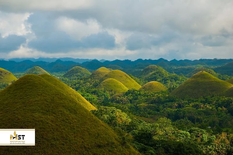 تپههای شکلات در فیلیپین معروفترین جاذبه بوهول هستند که در مساحتی به اندازه ۵۰ کیلومتر مربع، حدود ۱۲۰۰ مورد از این تپهها که همگی شکلی یکنواخت دارند و عمدتا بین ۳۰ تا ۵۰ متر ارتفاع قرار گرفتهاند. این تپهها پوشیده از پوشش گیاهی و سبز هستند اما در فصل خشک به خاطر خشک شدن چمنها به رنگ قهوهای در میآیند و شبیه شکلات میشوند به همین دلیل این نام را به آنها دادهاند. طبق افسانهها این تپهها از نبرد دو غول به این شکل درآمدهاند اگرچه آنها در نهایت صلح کردند اما بقایای نبردشان باقی ماند. داستان دیگری حاکی از آن است که غول جوانی به نام آروگو عاشق دختری انسان به نام آلویا شد، پس از مرگ او، غول جوان به شدت گریه کرد و اشکهایش تبدیل به تپه شد. جدا از افسانهها، امروزه زمین شناسان توضیح دقیقی برای نحوه شکل گیری این تپهها ندارند، اگرچه توافق عمومی این است که آنها نوعی سنگ آهک دریایی در بالای یک لایه غیرقابل نفوذ از خاک رس هستند.