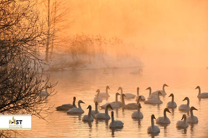 دریاچهی قو در کوهستان آلتای از جمله دیدنیهای مهم در سیبری به حساب میآید که عکاسان زیادی هر ساله برای ثبت تصاویری جذاب به آنجا میروند. البته تاریخ حضور قوها در این دریاچه خیلی به عقب بر نمیگردد و اولین بار این حیوان در سال ۱۹۶۷ در دریاچه دیده شده و حالا سالانه بیش از ۳۵۰ تای آنها در این محل زندگی میکنند و تعدادشان نیز رو به افزایش است. این تصویر بینظیر در هنگام طلوع آفتاب نیز در محل همین دریاچه ثبت شده است.