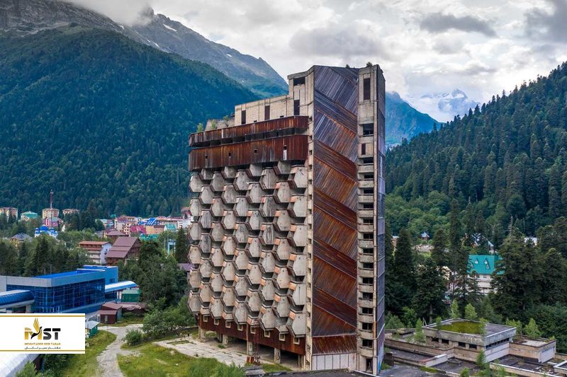 پروژهی نیمه تمام معروفی که در منطقه معروف اسکی و تفریحات برفی دومبای قرار بود ساخته شود اما هیچ گاه کار آن تمام نشد و در نهایت به یک بنای بزرگ متروکه در این محل تبدیل شد. دلیل رها کردن پروژه نیز، ترک خوردن پایه بنا و ریسک بالای اقامت و تجهیز آن به حساب میآمد. البته حالا این مکان به جایی ویژه در منطقه بدل شده و خیلی از مردم در میان تفریحات زمستانی خود، از این مکان دیدن میکنند و در کنارش عکس میگیرند. البته هیچ نظارتی بر روی این مکان وجود نداشته و اگر خواستید، امکان وارد شدن به آنجا را نیز دارد.
