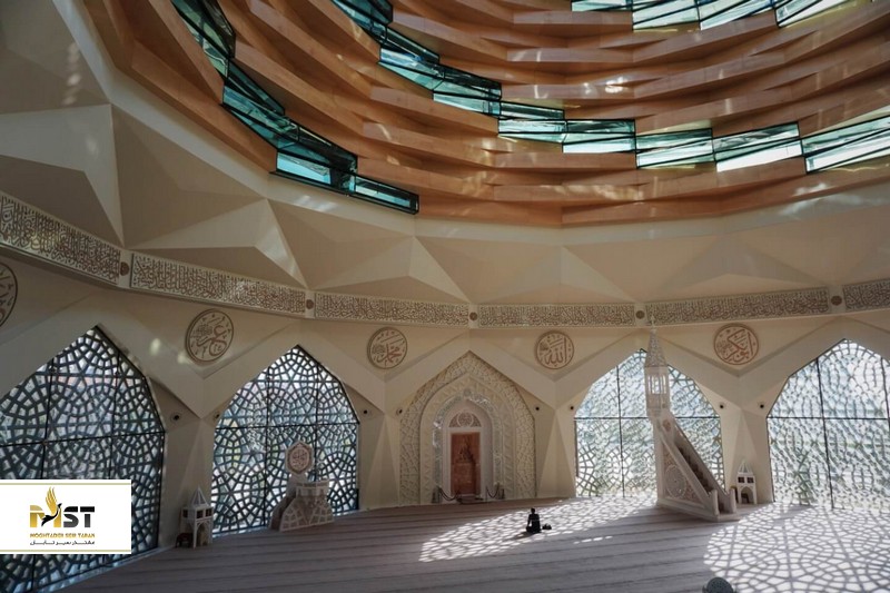 فضای داخلی با یک گلدان طلایی استعاری تزئین شده که نقطه کانونی این طراحی محسوب میشود. یک محراب با ظاهری حماسی نیز در این فضا وجود دارد که در حقیقت، یک طاقچه نیم دایرهای در دیوار است که جهت کعبه را در مکه نشان میدهد و در نتیجه به جهتی که مسلمانان در هنگام نماز باید به آن رو کنند، اشاره میکند. در نهایت توجه داشته باشید که خانمها و آقایان باید از دربهای جداگانه وارد شوند و قبل از ورود، کفشهایشان را در بیاورند.