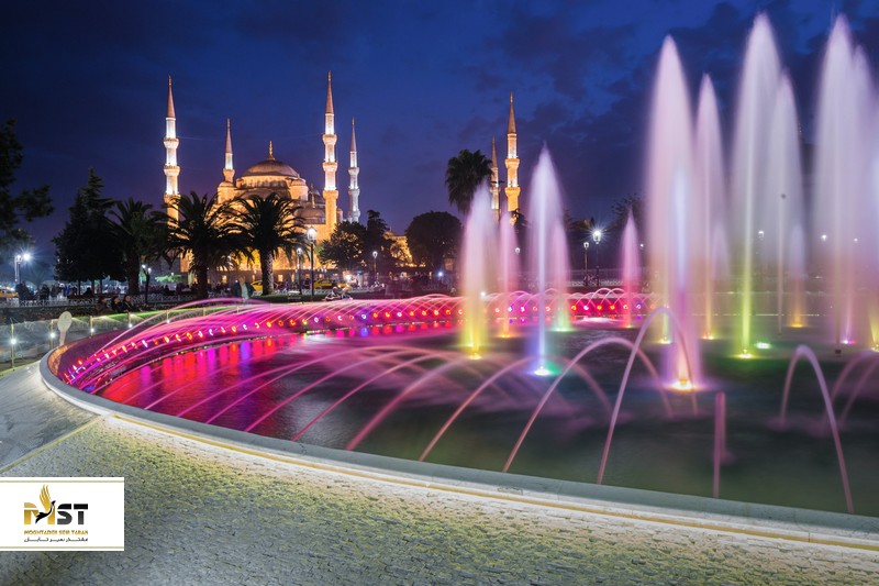 مسجد آبی که به مسجد سلطان احمد (Blue Mosque) هم شناخته میشود یکی از جاهای دیدنی در استانبول است که واقعا ارزش دیدن و تماشا را دارد و اولین جایی است که هر توریستی خودش را به آن میرساند. به عنوان توریستی مشتاق اگر به گشت و گذار و تفریح شبانه در استانبول مشغول هستید باید سری به اینجا هم بزنید. این جاذبه دیدنی و تاریخی که به نوعی نماد استانبول هم محسوب میشود در هر ساعتی از شبانه روز زیباست و در شب هم جلوهای خیره کننده از خودش به نمایش میگذارد. پارک سلطان احمد، در روز، معمولا دارای فروشندگان خیابانی است که غذاهای عجیب و غریب میفروشند، در طول رویدادهای خاص یا ماه رمضان، مسجد آبی و پارک سلطان احمد همیشه به طرز چشمگیری تزئین میشوند. به علاوه در طول عصر، فواره نورانی و رنگی آن منظرهای جادویی دارد. فواره رقصان در چند قدمی مکانهای گردشگری معمولی مانند کاخ توپکاپی، ایاصوفیه و غیره قرار دارد که میتوانید از آن بازدید کرده و در امتداد جاذبههای برجسته استانبول قدم بزنید.
