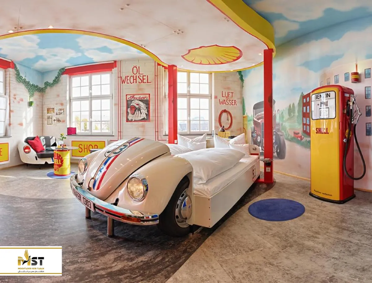 این هتل مختص آنهایی است که عاشق ماشین هستند! تمامی اتاقهای این هتل با تمهای مختلف مرتبط با ماشین یا فیلمهایی که مربوط به ماشین بوده درست شدهاند و در هنگام رزرو اتاق، میتوانید بین آنها، یکی را برای اقامت خود انتخاب کنید. برای مثال، یکی از اتاقها به شکل سینماهایی که با ماشین برای دیدن فیلم میروید درست شده، یکی به شکل کارواش است و یکی دیگر، با تم مسابقات اتوموبیل رانی درست شده.