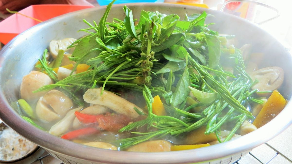 در نهایت Jim Jum، یک هات پات به سبک آیسان است که از غذاهای گیاهی تایلندی پرطرفدار در دورهمیهای دوستانه و خانوادگی به شمار میآید. برای تهیه این غذا، سس اولیه یا آب همراه با ادویهجات و ترشیجاتی نظیر آبلیمو، تمر هندی، فلفل چیلی و پیاز در قابلمهای روی اجاق گاز داغ قرار میگیرند و سایر مواد و سبزیجات نیز به این ترکیب اضافه میشوند.