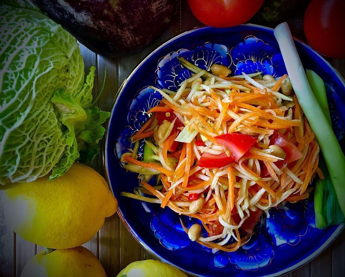 Som Tum، نوعی سالاد پاپایا و از محبوبترین غذاهای گیاهی تایلند است. این غذای خوش طعم از سیر، شکر، لیموترش و آب تمر هندی، فلفل قرمز کوبیده شده (بسیار تند)، در ترکیب با پاپایای سبز تازه خرد شده، گوجه فرنگی آبدار و بادام زمینی تشکیل شده است. به این سالاد معمولا، سس ماهی و میگوی خشک اضافه میشود. اما اگر گیاهخوار هستید، گزینه گیاهی و بدون روغن ماهی و سس ماهی را سفارش دهید. در واقع بیشتر اوقات، این غذا را در مقابل شما درست میکنند، بنابراین شما میتوانید بگویید که چه چیزی باید اضافه یا حذف شود. گفتنی است مناطقی مانند بانکوک و پوکت، برای خوردن این سالاد شهرت بیشتری دارند.