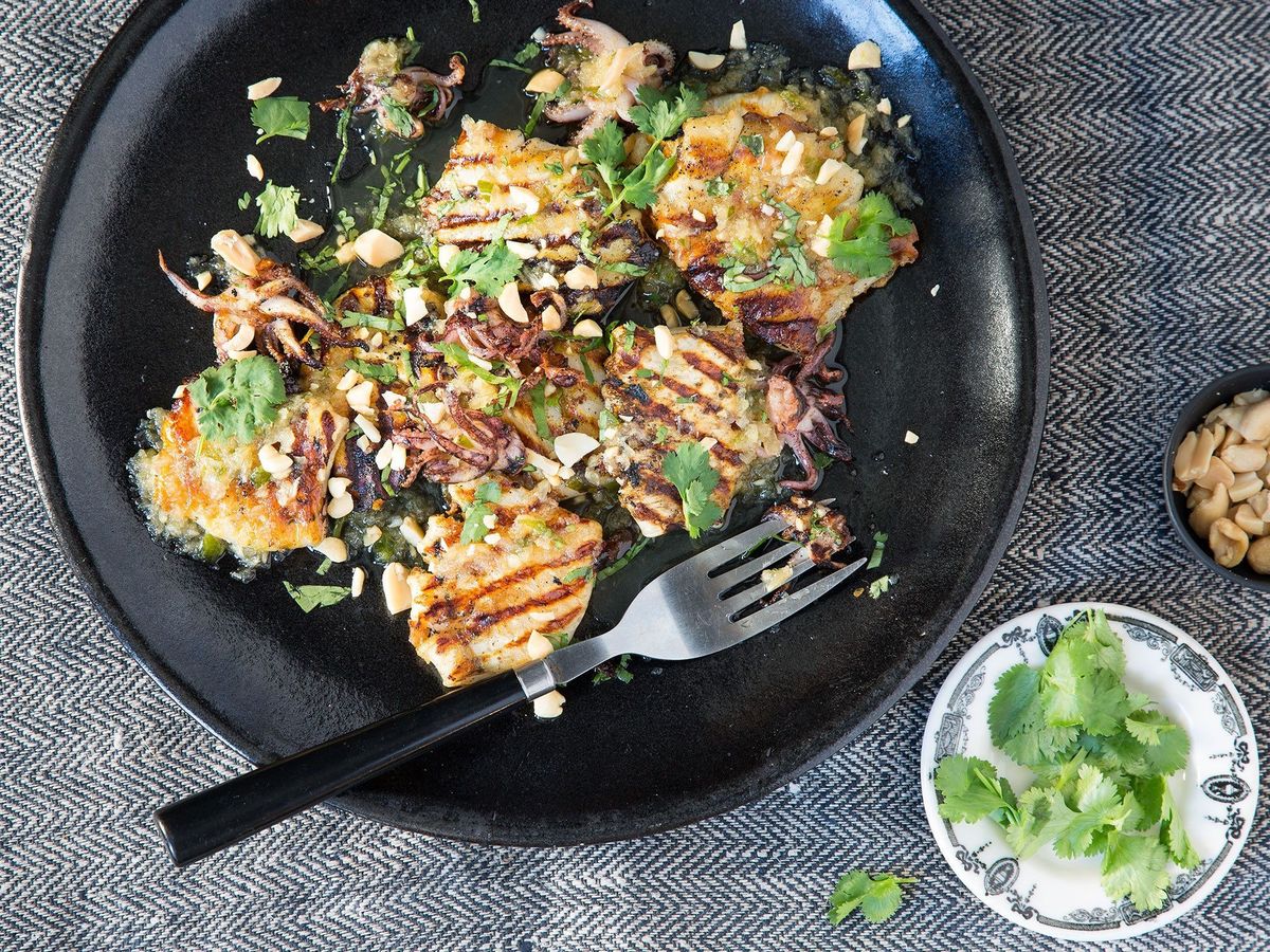 در انتهای معرفی غذاهای حلال تایلندی، به Pla Muek Yang میرسیم. برای تهیه این غذا از ماهی مرکب ترد استفاده میشود که سخاوتمندانه با روغن آغشته شده و با زغال سنگ کبابی میشود. سپس روی ماهی مرکب، آجیل ترد و مخلوطی از لیموترش، زنجبیل و گیاهان خرد شده میریزند که روح جدیدی را به بشقابتان میبخشند. بنابراین اگر به دنبال غذای حلال تایلندی هستید، حتما نگاهی نیز به این غذای دریایی دل انگیز داشته باشید.