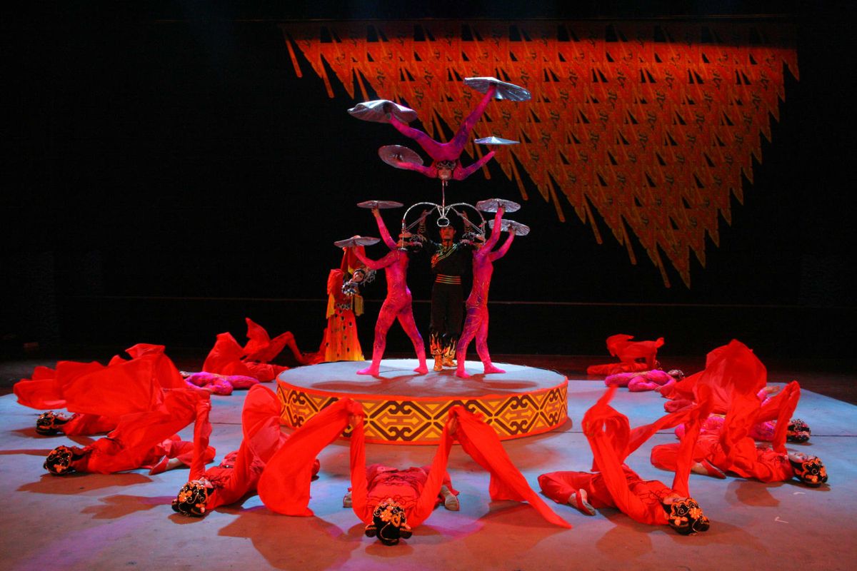 و به سرعت دوباره همه چیز با یک چرخ بزرگ فلزی که از بالا سقف آویزان شده تغییر میکند و آکروبات بازهای چینی بر روی این وسیلهی جالب، به انجام حرکات عجیب دست میزنند.