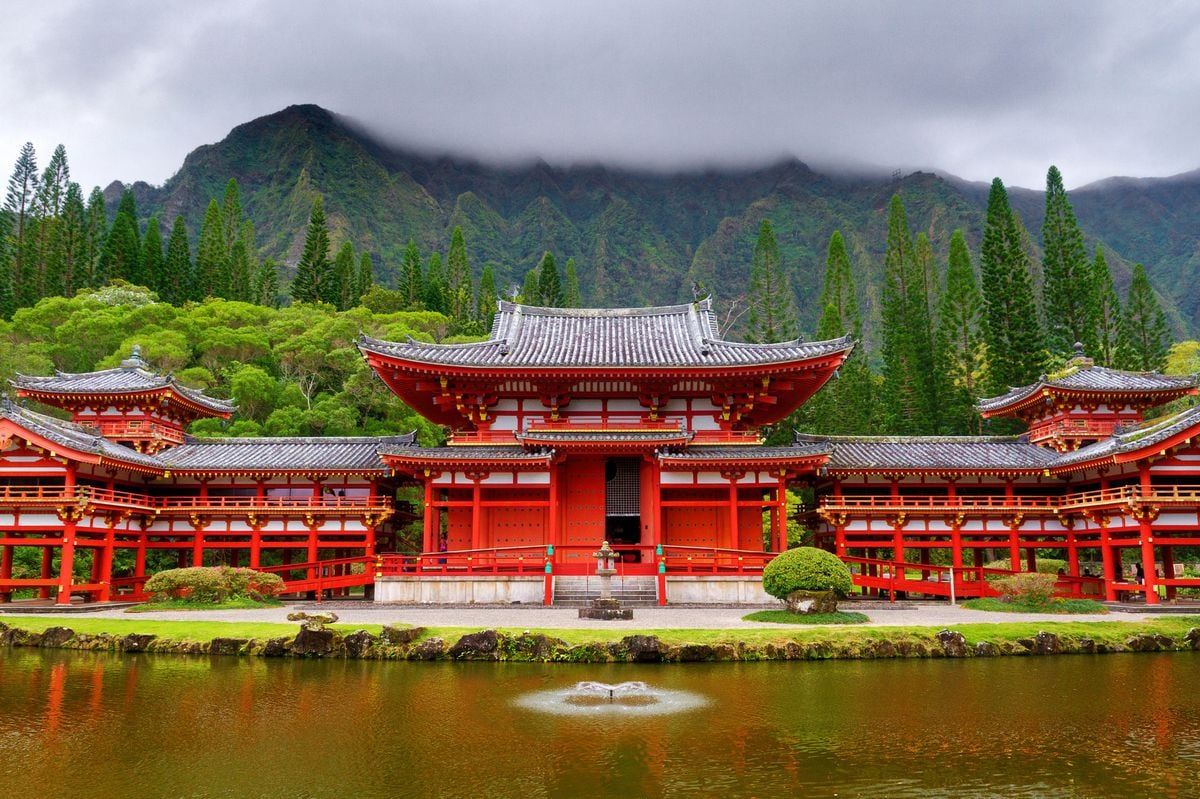 در آن سمت دنیا در هاوایی نیز، مردم زیادی به آیین بودایی گرایش دارند و البته یکی از زیاترین معابد بودایی در جهان نیز در این کشور واقع شده است. معبد بیدو-این (Byodo-In) بنایی ۹۰۰ ساله در اوجی (Uji) است که پارکی سرسبز به دور آن ساخته شده تا زیبایی آنجا دو چندان شود. معماری کلی معبد بیدو-این شبیه به معابد ژاپنی است و در سقف آن از طلا استفاده شده است.