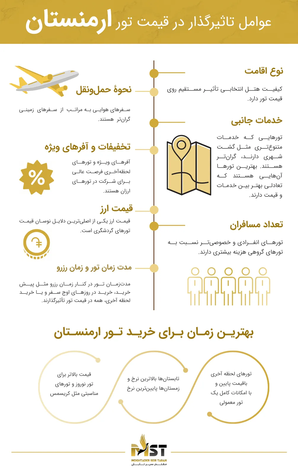 توصیه میکنیم برای خرید تور ارمنستان، از «مدارک لازم، بیمه مسافرتی، ترنسفر فرودگاهی و راهنمای فارسیزبان» غافل نشوید. در نهایت نظرات مثبت و منفی مسافران را درباره تورها، هتلها و جاذبههای گردشگری مقصد بخوانید تا بتوانید از جمعبندی آنها تصمیمگیری هوشمندانهتری داشته باشید.