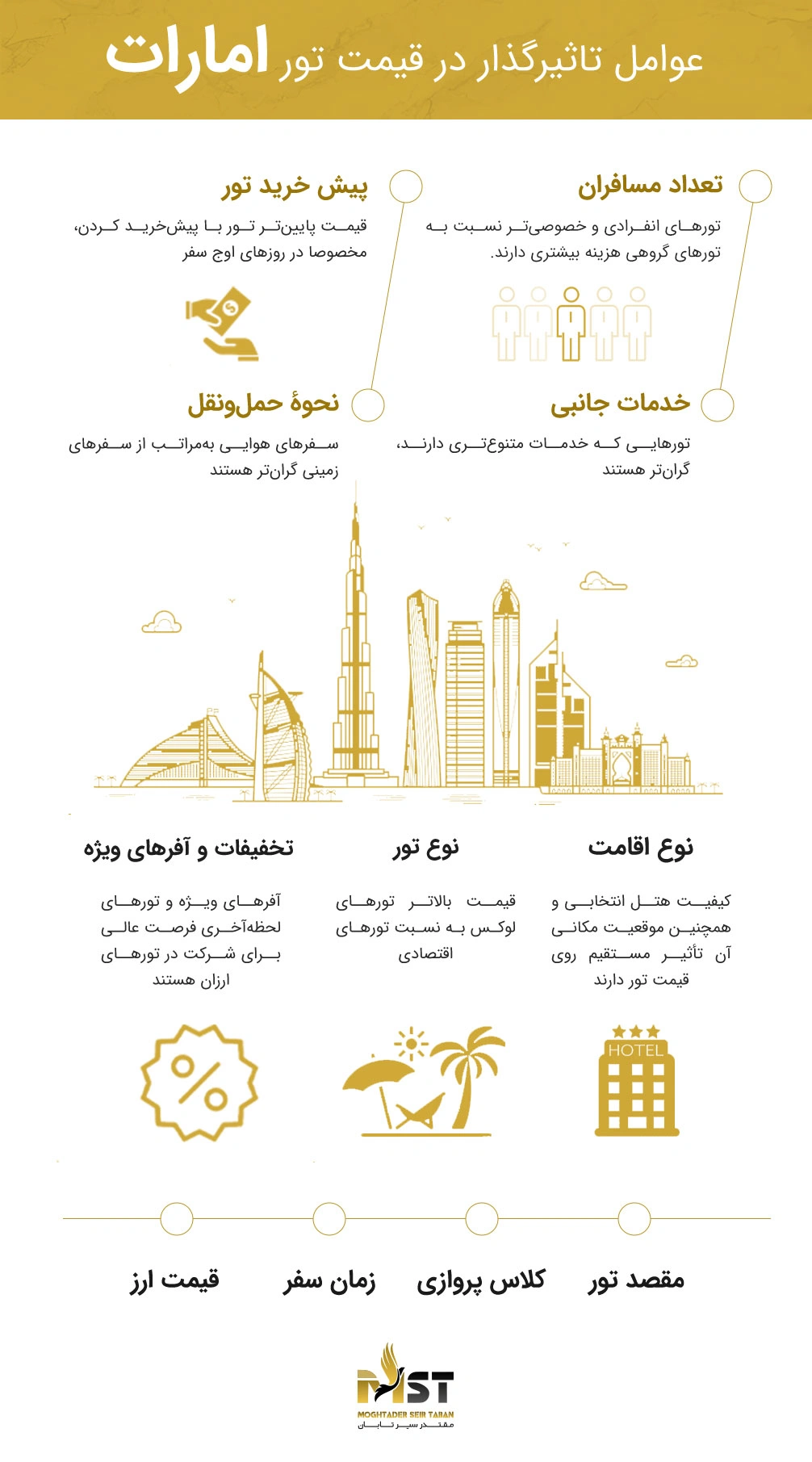تور امارات به واسطه وجود شهرهایی مثل دبی و ابوظبی یکی از محبوبترین تورهای گردشگری در جهان است. مقصدی لوکس و جذاب که ایرانیهای زیادی هم هر ساله به آنجا میروند. در مقالهای که امروز برایتان تهیه کردهایم به صورت کامل به جنبههای مختلف و نکاتی که باید درباره رزرو تور امارات بدانید میپردازیم تا در نهایت بتوانید بر اساس بودجه و سلیقهتان، تور مناسب خود را انتخاب کنید.