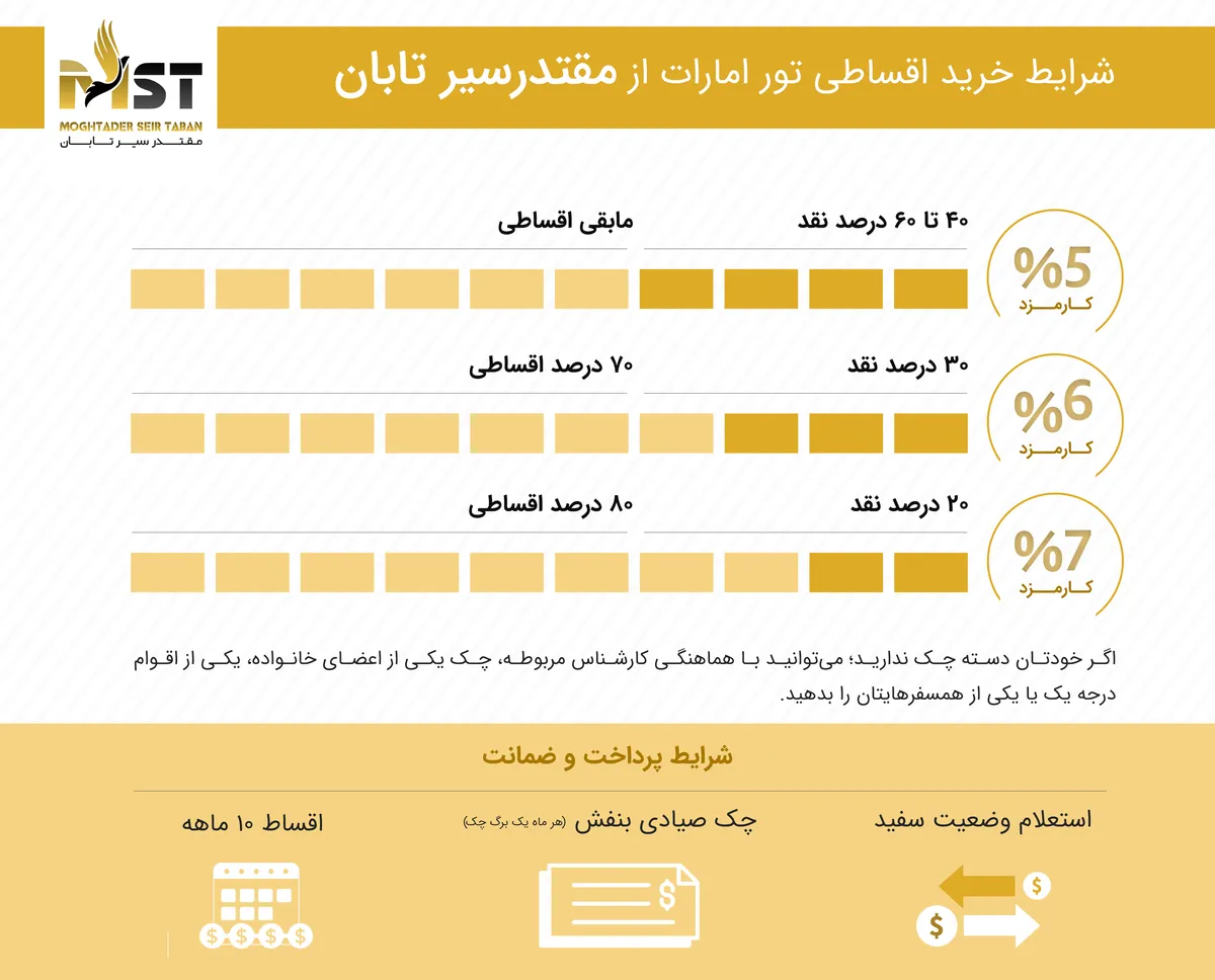 با امکان خرید تور اقساطی امارات، شما میتوانید همین حالا به امارات سفر کرده و با پیش پرداخت بسیار کم و کارمزد پایین، هزینۀ آن را ده ماهه پرداخت کنید! شرایط تور اقساطی در مقتدر سیر بسیار مناسب بوده و شما کافی است تا با کارشناسان فروش تماس گرفته، تور مد نظر خود را انتخاب کنید و مدارک مربوط به آن را ارسال نمایید.