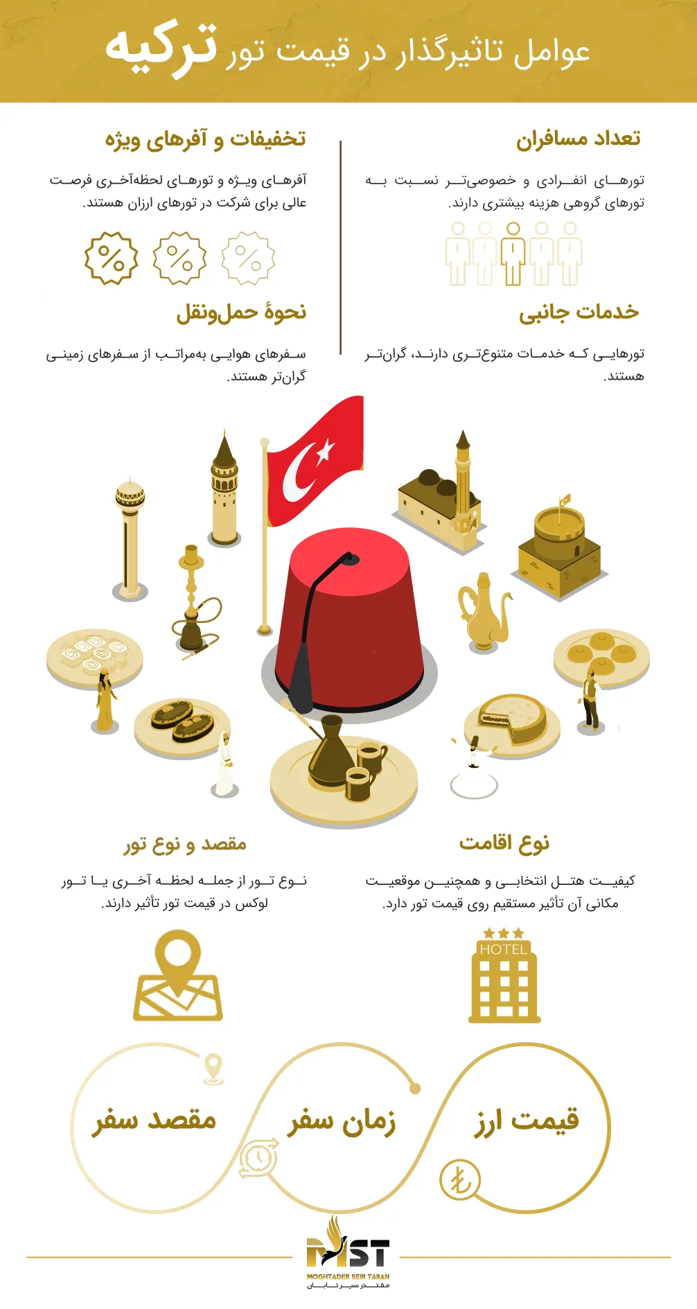 اگر از آن دسته افرادی هستید که فکر میکنید برای داشتن بهترین سفر باید گرانترین تور را بخرید، کاملا در اشتباهاید! شما با دانستن چند نکته مهم در مورد سفر به ترکیه میتوانید بهترین تور را با قیمتی عالی رزرو کنید و تجربه سفری به یادماندنی به این کشور رنگارنگ داشته باشید. به عنوان مثال کم نیستند افرادی که هزینه زیادی را بابت رزرو تور خود پرداخت میکنند اما به دلیل انتخاب آژانس مسافرتی نامناسب خدمات ایدهآلی را دریافت نمیکنند. همچنین گردشگرانی هستند که بدون توجه به شرایط آب و هوایی مقصد نامناسبی را برای سفر انتخاب میکنند و متاسفانه شرایط خوبی را در سفرشان تجربه نمیکنند. پس اگر تجربه کافی برای سفرهای خارجی ندارید توصیه میکنیم حتما در رزرو تور ترکیه از توجه به نکات زیر غافل نشوید: