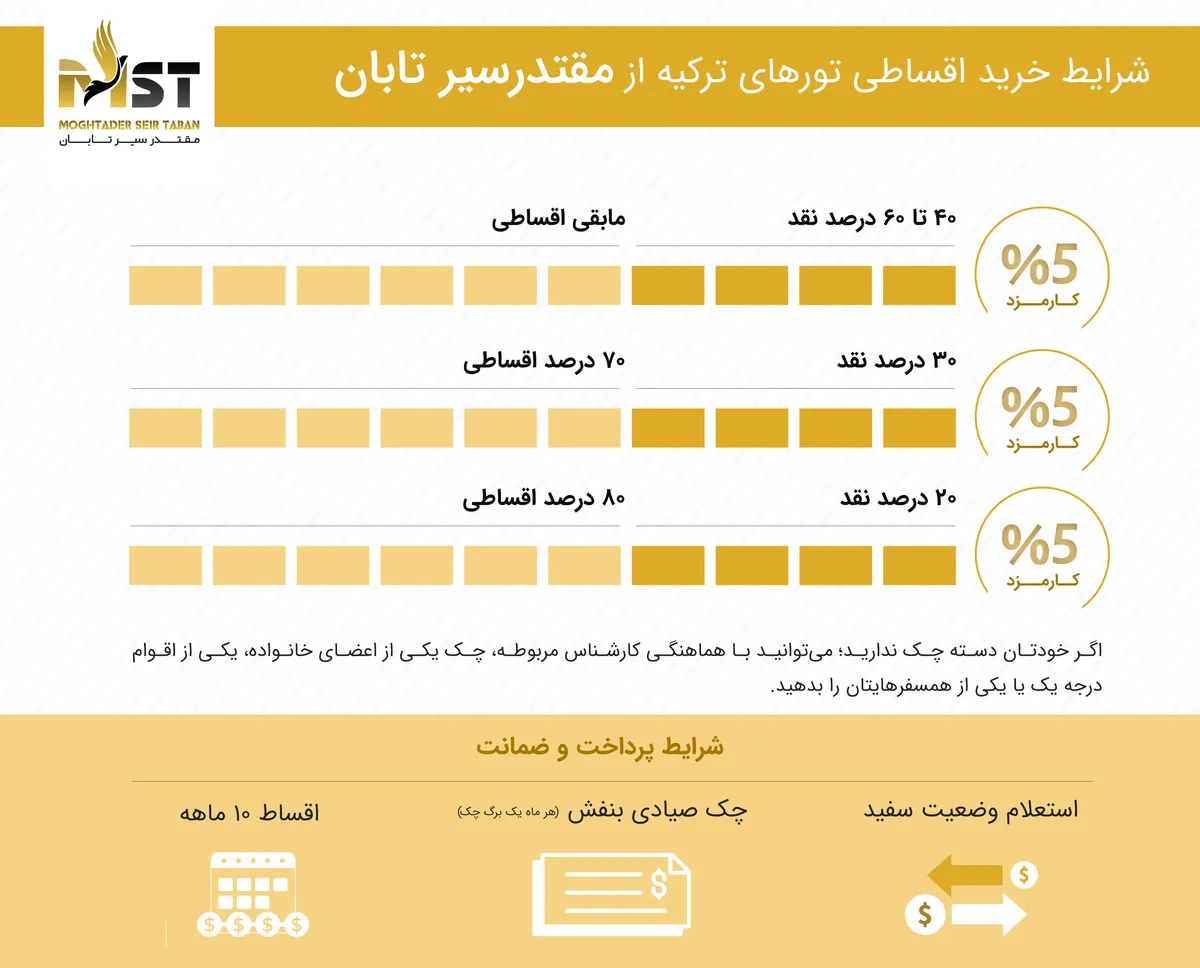 پیش از رزرو قطعی تور ترکیه حتما از شرایط پرداخت و قیمت آن مطلع شوید. آژانس مسافرتی مقتدر سیر از همان ابتدا شرایط پرداخت را به صورت واضح در اختیار مشتریان خود قرار میدهد و جای هیچگونه ابهامی را برای آنها باقی نمیگذارد. خبر خوب دیگر اینکه، مقتدر سیر، امکان سفر به صورت قسطی را نیز برای مشتریان خود فراهم میکند. تورهای اقساطی ترکیه را میتوانید با حداقل سود، بدون نیاز به ضامن و تنها با ارائه چک صیادی از ما خریداری کنید. اطلاعات تکمیلی در مورد شرایط اقساط تورهای ترکیه مقتدر سیر در جدول زیر آورده شده است: