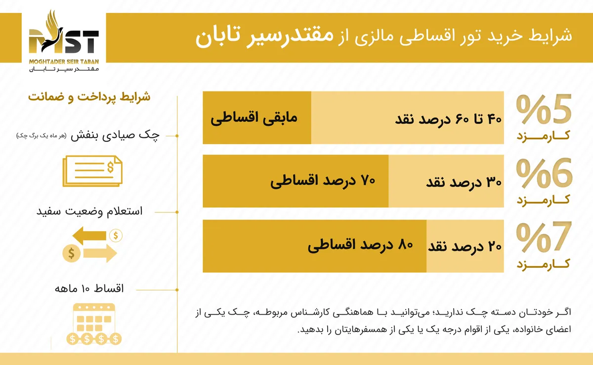 میتوانید 20% تا 60% مبلغ نهایی تور را بهعنوان پیشپرداخت و مابقی را در 10 قسط ماهیانه پرداخت کنید.