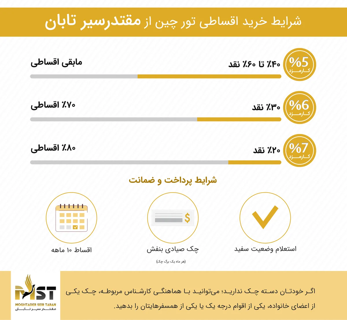مقتدر سیر تلاش میکند تا تورهای باکیفیت و خوبی را با قیمت مناسب در اختیار شما قرار دهد. اگر دوست دارید سفری به کشور چین داشته باشید اما هزینه تور چین شما را نگران میکندسفر با تورهای اقساطی چین توصیه میشوند. شما میتوانید امروز برای خرید بلیط هواپیما چین، رزرو هتل و حتی دریافت ویزای چین اقدام کنید و تا ۱۰ ماه دیگر پرداخت کنید. تورهای اقساطی چین تنها با پرداخت ۲۰ درصد پیشپرداخت و با کمترین کارمزد برای مسافران مقتدر سیر برگزار میشوند. تنها چیزی که برای این کار لازم دارید، دسته چک صیادی بنفش با وضعیت استعلام سفید است. اگر خودتان دسته چک ندارید؛ میتوانید از چک یکی از اعضای خانواده یا حتی همسفرهایتان استفاده کنید.